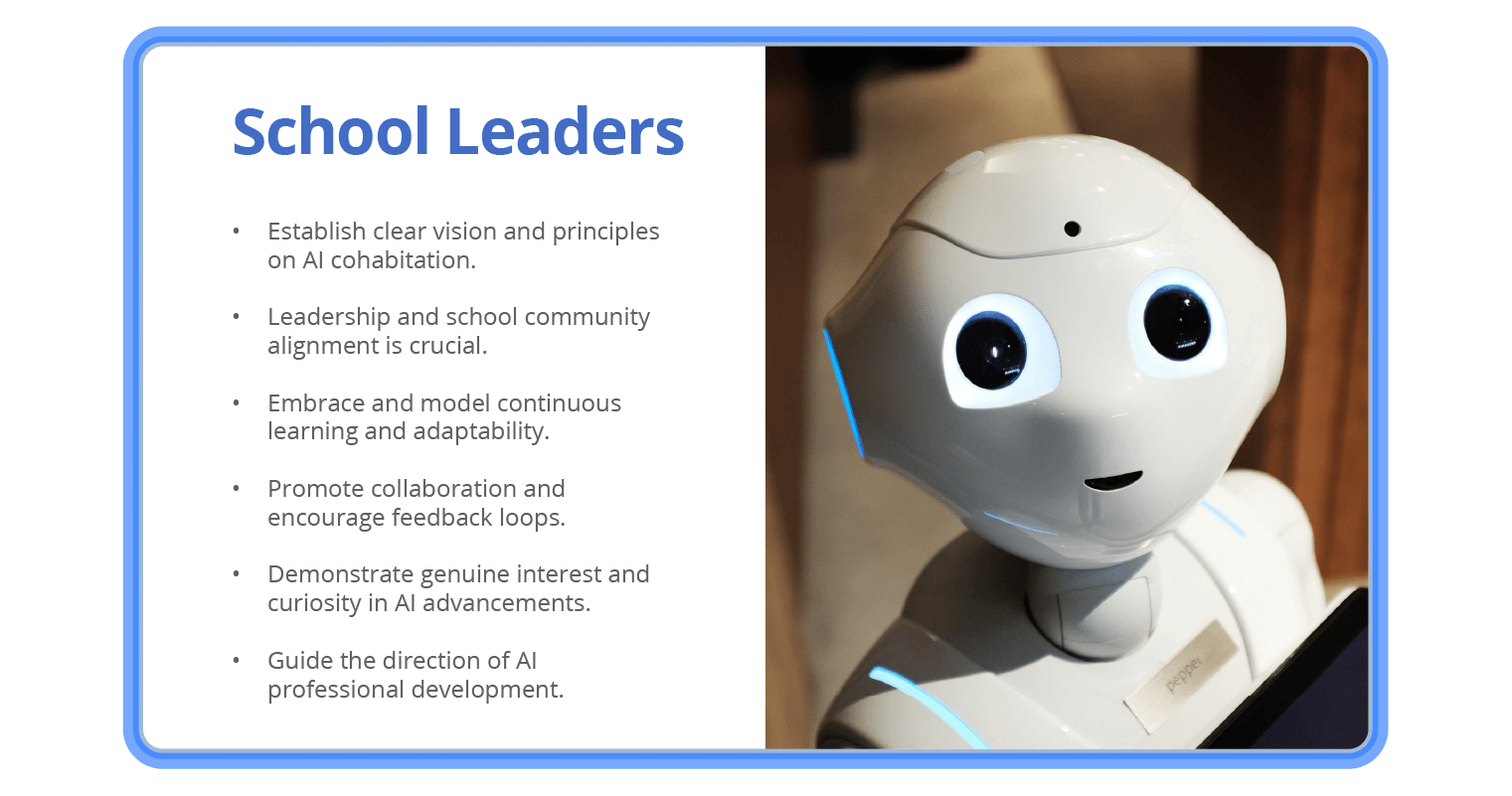 Introduce the basics to all teachers, allowing them to explore implications in their subject areas, and have early adopters share the ways they integrate AI tools to support other teachers. Departments are a key place for sharing explorations.