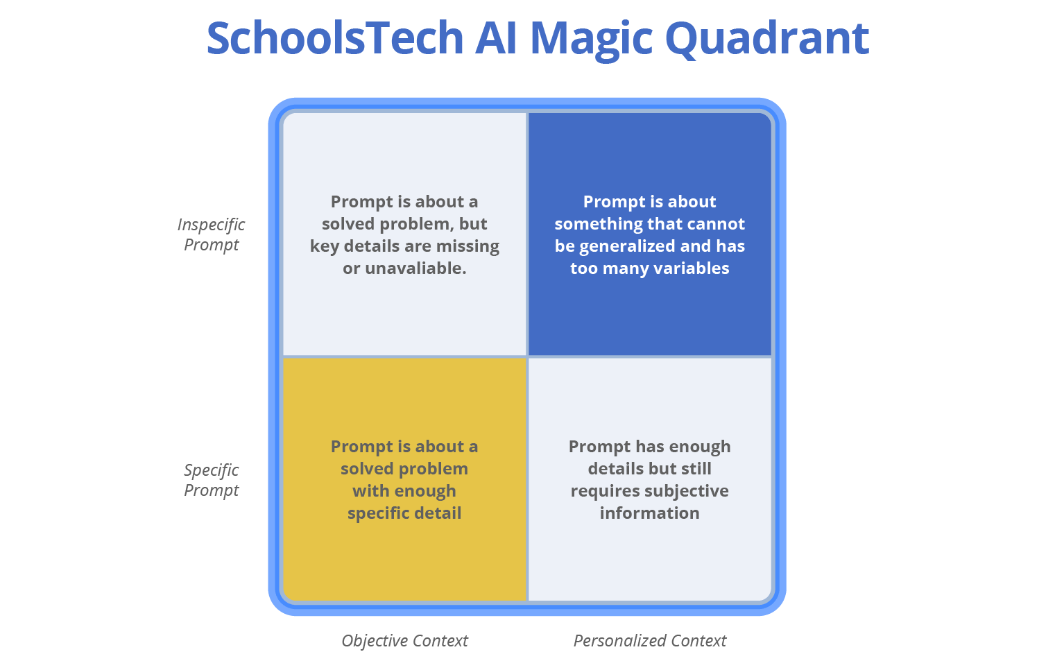 - Portraying the AI as having a bubble of limited knowledge/context – the teacher must guide it and apply their own expertise about students/context.