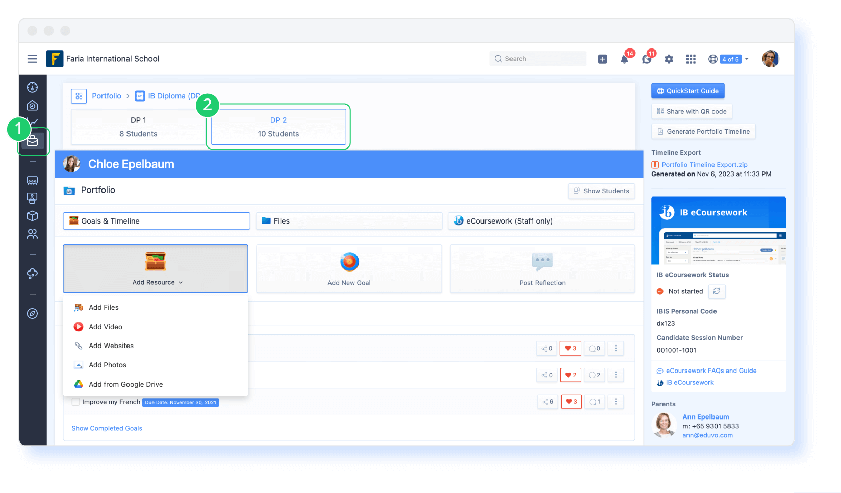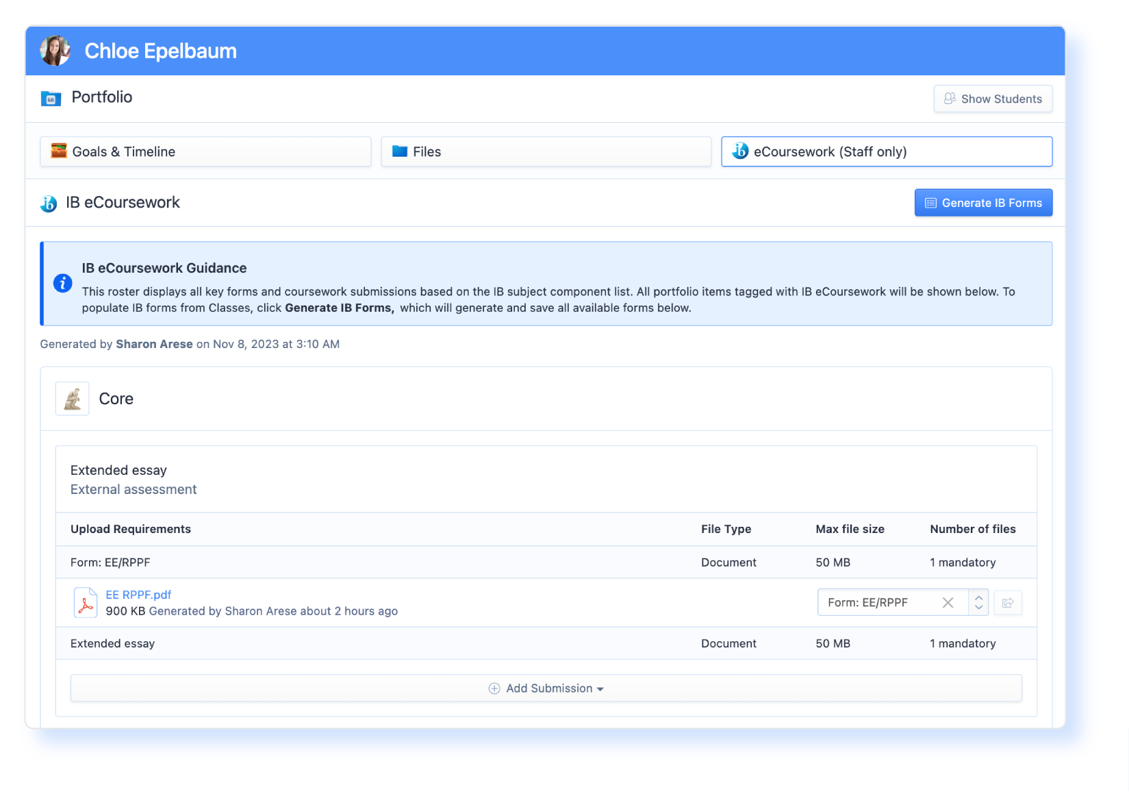 ManageBac has been the platform that every teacher has used with us, high school students. All of our documents have been submitted through ManageBac, wherein we have then received feedback, plagiarism reports, and more. The Portfolio - eCoursework feature was essential for organising files. With many files routinely uploaded onto ManageBac, this feature helped us find everything in one place, and keep track of all of the submissions, revisions and versions. Moreover, this feature helped facilitate the process of uploading official IB documents, since all information was easily accessible. Aanya Choksi, DP 2 student