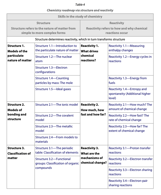 When you look at the guide, you will no doubt start looking at the content which has been reordered and put into a roadmap. The roadmap reflects the way that the IB would like you to teach the course. The backbone to this is that they would like you to teach the course conceptually using both the new slimmer Nature of Science statements and the five ATL attributes. The course is split into two broad concepts of ‘Structure’ and ‘Reactivity’ that are then linked by smaller sub-concepts such as S2.1 The Ionic Model or R3.3 Electron Sharing Reactions. Inside each of these smaller sub-concepts there are the syllabus statements that link the concept together.