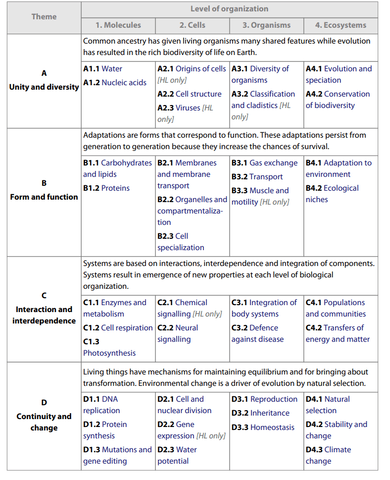Content The content has changed a lot in some places and remained the same in others. The first change you will notice is that the options have been removed; more on this below with assessment changes. Some of the option content has been subsumed, and other content deleted. The Teacher Support Material, coming out in August 2023, will contain a list of additions and deletions. The syllabus statements have become more descriptive so that teachers will now have a better idea of what specifically needs to be taught. The intention is that there will be less implied knowledge than the legacy guide (LA 2024). The “skills in the learning of biology”, which is a descriptive list of skills students need to know, should help clarify what students need to be able to do in the internal assessment and in the data analysis questions on Paper 2. The other big change is the move towards conceptual, networked learning. The IB roadmap, taken from the IB DP Biology guide and shown in Figure 1, provides two possible concept-based pathways, a theme-based sequence and a level of organisation sequence, in which the course could be taught. They DO NOT need to be taught in either order. The IB encourages teachers to create their own roadmaps that match their circumstances and needs. The new organisational structure and changes in the arrangement of the content is to highlight and encourage the development of conceptual knowledge in biology with the intention that this will help with student understanding. Note that both syllabi are currently available in the ManageBac Unit Planner for the transition year, allowing you to switch across any planned units with only a few clicks.