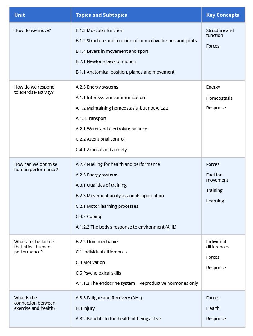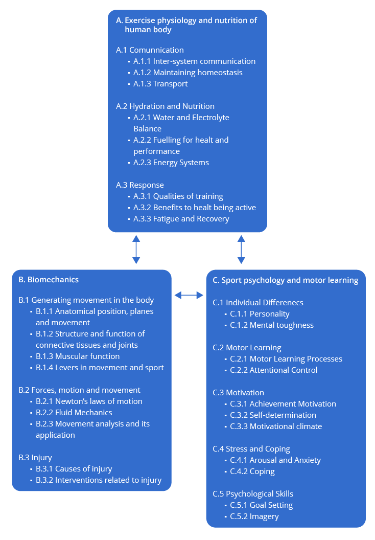 The content has been significantly adapted throughout. Although some remain familiar, for example, the physiology section, the first stand-out difference is that the options have been removed; more on this below with assessment changes. Some options content has been subsumed into other units, and some has been deleted. The syllabus statements have become less descriptive, giving teachers greater freedom to challenge our learners as they see fit. I strongly encourage teachers to use the exemplar exams as a guide to pitch the content at the right level. There are individual sections for the skills students need to master for the internal assessment and section 2 of Paper 1. It is well worth mapping out this part of the guide with your new units (available on ManageBac Unit Planner). The other big change is the move towards conceptual, networked learning. The IB roadmap, shown in Figure 1, provides several different possible concept-based pathways or theme-based sequences in which the course could be taught. It does not need to be taught in topic order, which I strongly discourage. The IB encourages teachers to create roadmaps that match their circumstances and needs. The new organisational structure and changes in the arrangement of the content are to highlight and encourage the development of conceptual knowledge in SEHS to help with student understanding. The IB has created a teaching pathway (see Figure 1 below) that teachers might wish to adopt. It is well worth looking out for the linking questions as examples of where teachers can link across the themes (physiology, biomechanics, and psychology) to create a holistic understanding of sports, exercise, and health science. Again, I encourage teachers to develop linking questions to support their students' learning. Note that both syllabi are available in the ManageBac Unit Planner for the transition year, allowing you to switch across any planned units with only a few clicks.